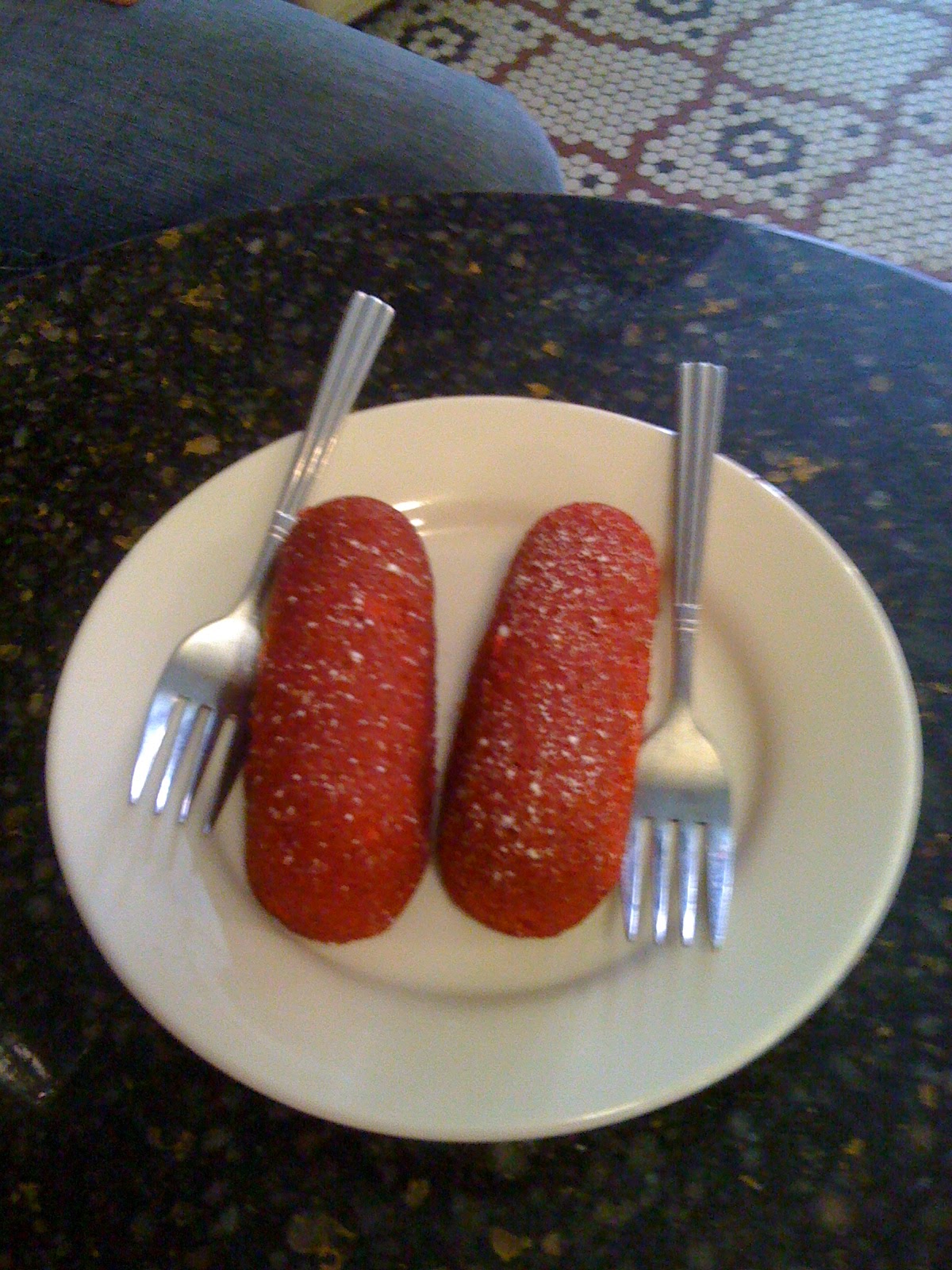 Friday: While mother-in-law watched the babies, we went for coffee at Brooklyn Farmacy & Soda Fountain. We made Valentine's Day cards for each other while we waited for our red velvet Twinkies. (Yes, to die for.)